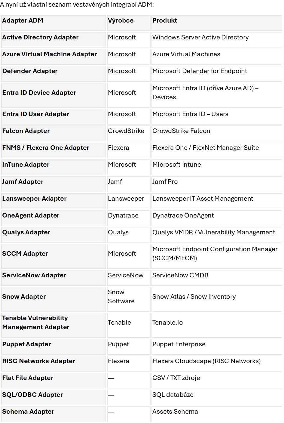 Z dostupných adaptérů je vidět, že Atlassian se primárně zaměřuje na nejpoužívanější Operations nástroje, a zároveň se snaží nabídnout i možnost načítat data z dalších asset management platforem – byť řada z nich nebude na českém trhu příliš známá.